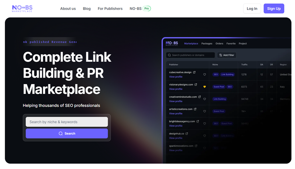 NO-BS Marketplace is a guest posting and link building platform that connects you with a network of vetted sites for placements. Agencies especially like that it removes much of the outreach workload while still letting them pick sites and topics.
