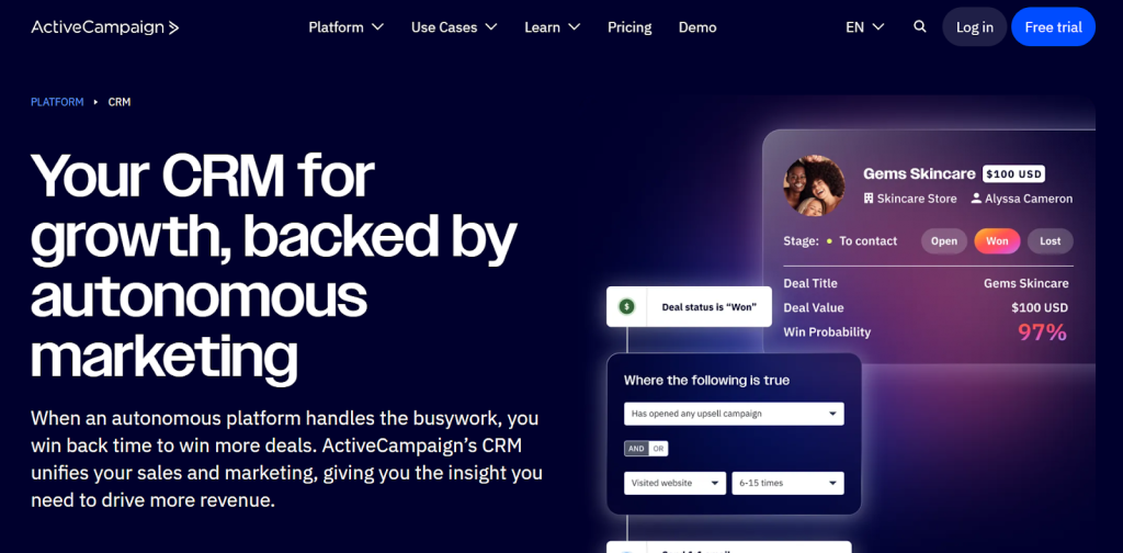 ActiveCampaign blends CRM capabilities with a thoughtful approach to automation and personalized communication. It’s particularly appealing to businesses that want to build customer journeys that adapt to individual behaviors. The environment feels polished and structured, supporting teams who want a combination of sales sequencing and marketing depth. If personalization is a priority, ActiveCampaign provides the right set of tools.