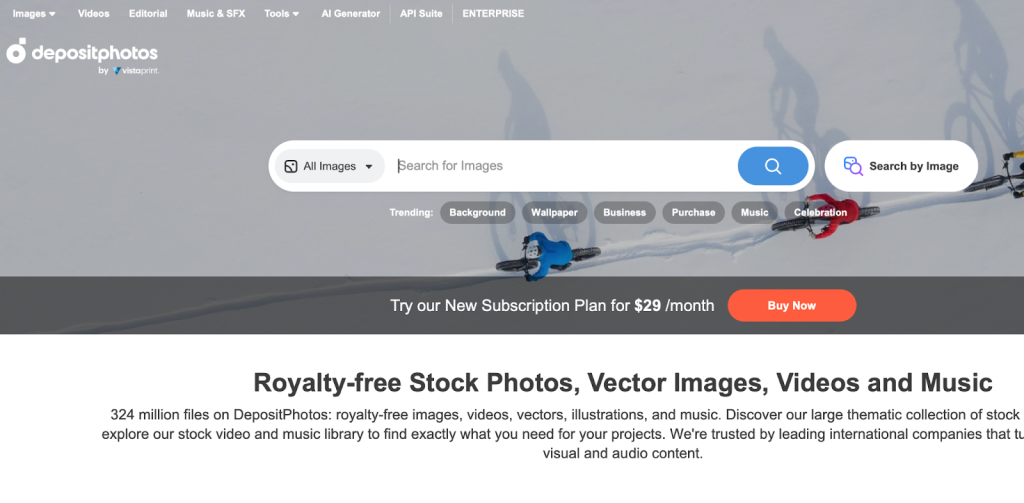 Depositphotos is a paid stock photography platform with an extensive library of images, vectors, and videos. It is known for competitive pricing and flexible plans, which appeal to small businesses and growing teams.
